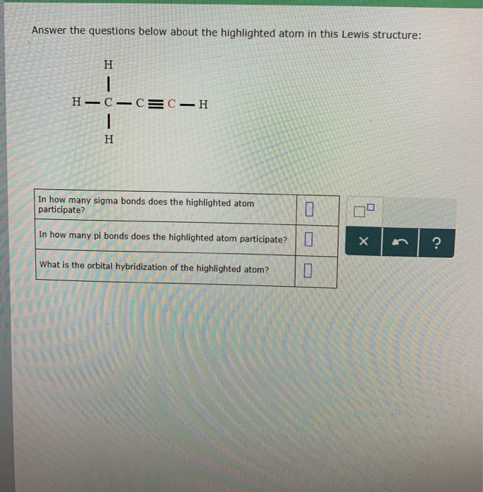 Answer The Questions Below About The Highlighted Atom In This Lewis Structure H H H Homeworklib - In how many pi bonds does the highlighted atom participate?